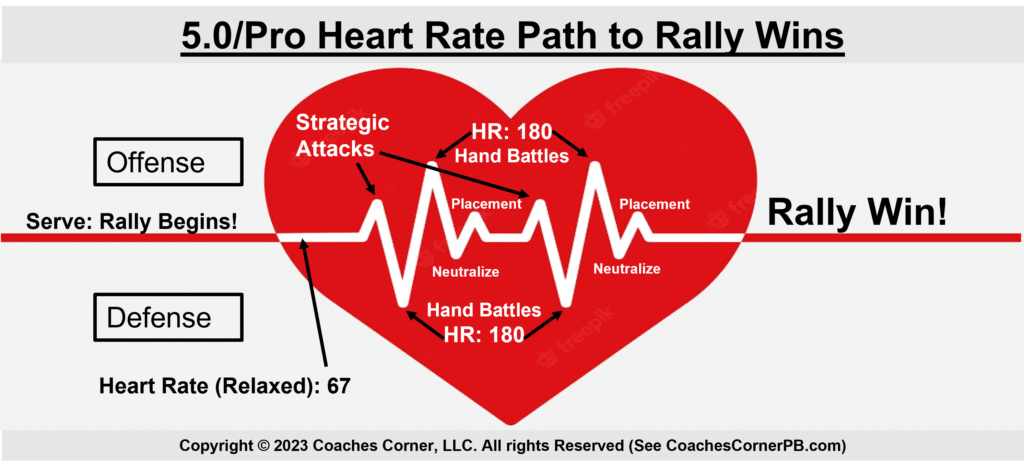 Pro Tip: Control your heart rate! Amping up for the kill shot or aggressive play is akin to a heart rate jumping instantly up to 180 beats per minute and reacting with intense haste. Fluctuating from 180 to 67 and back to 180 if needed – is THE strategy in high-level performance. Study this diagram with INTENSITY – and read on …